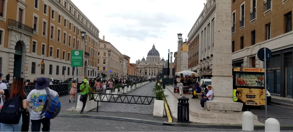 コンチリアツィオーネ通り(Via della Conciliazione)はサンタンジェロからサンピエトロ大聖堂をつなぐ大きな通りです。ここには各国の大使館があるようです。動画には各国の国旗が見えます。カナダ、コロンビア、ブラジルなどの国旗も見えます。